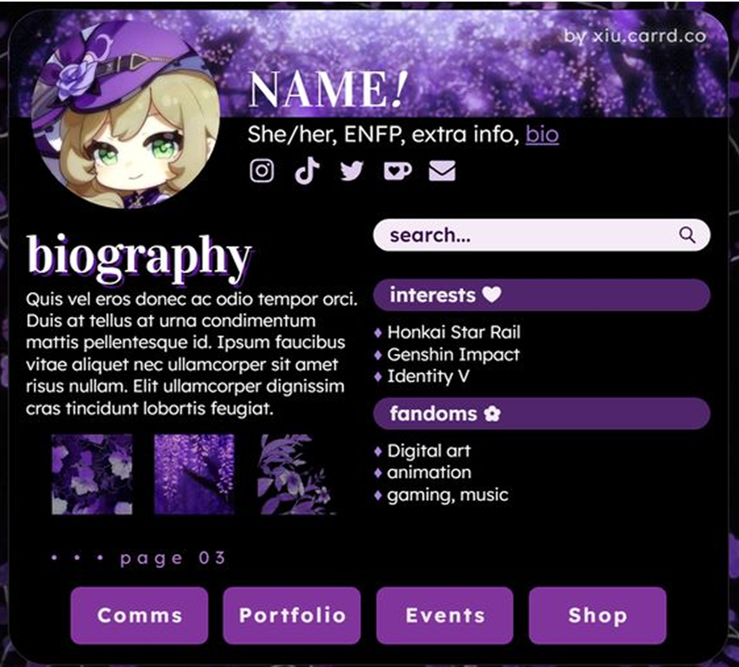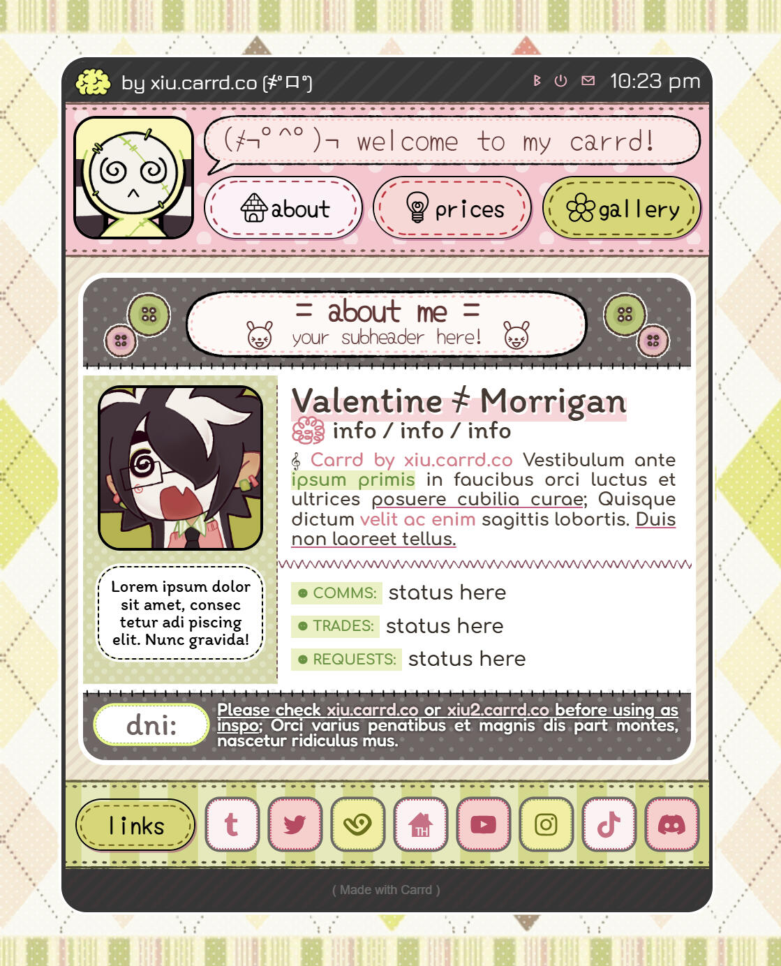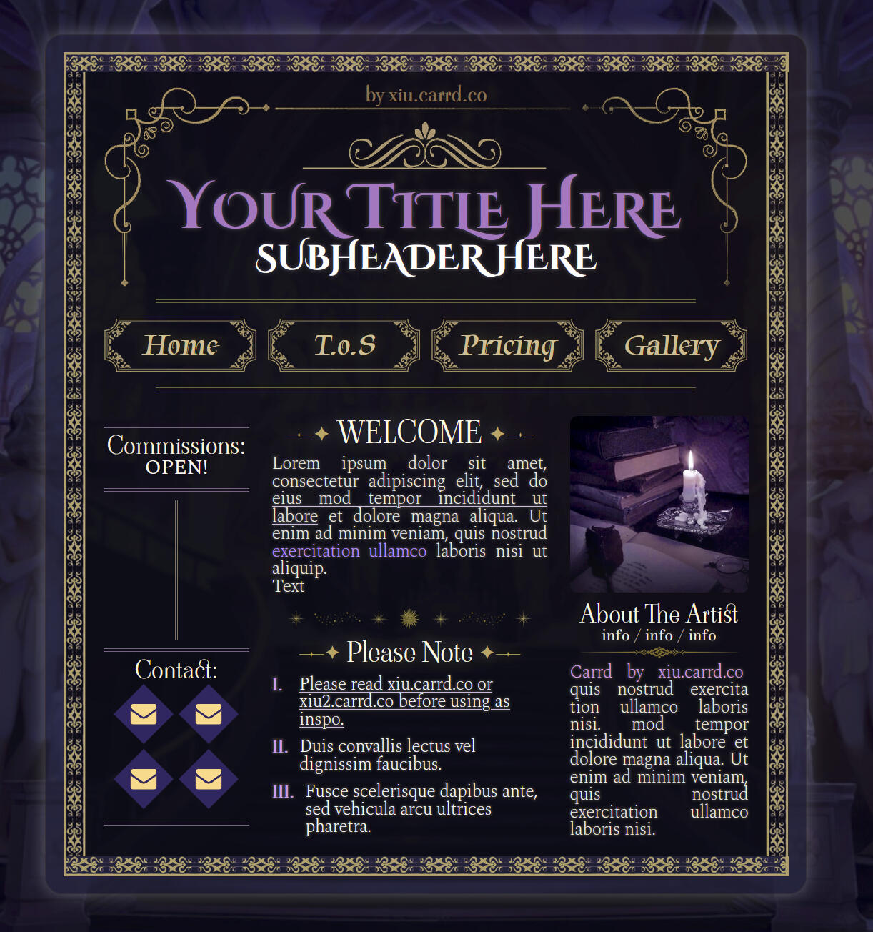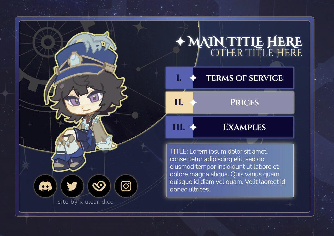 If you have an existing Carrd/Strawpage/Rentry/Google Doc/etc, I can insert the text from those platforms into your Carrd. You can also send the text to me over DMs! This is not mandatory, and I will default to using Lorem Ipsum if you don't have text available for me to use.