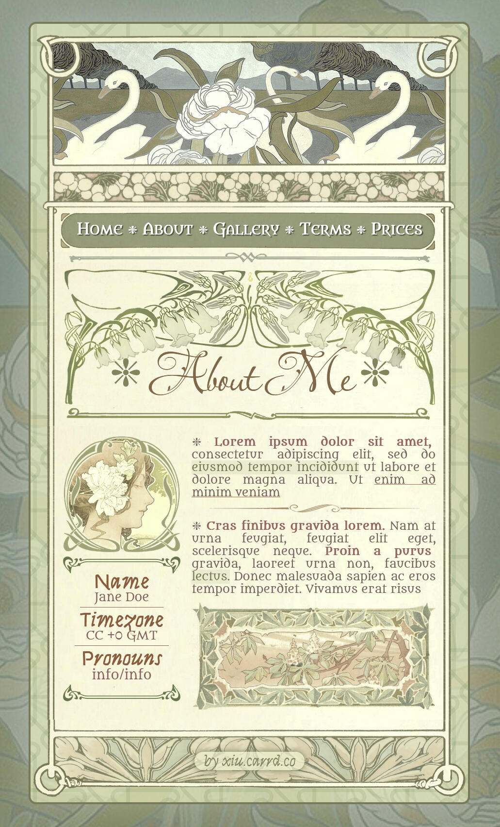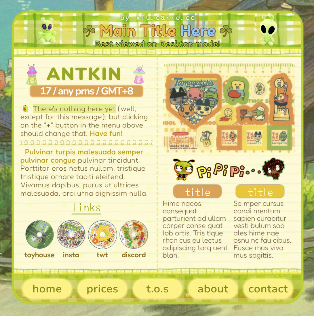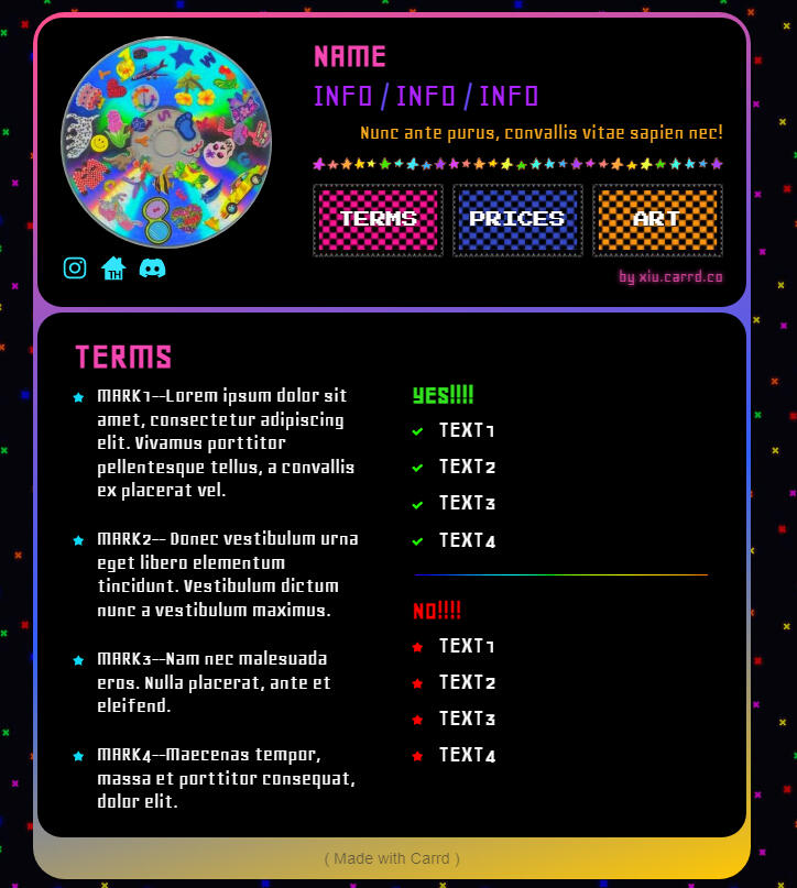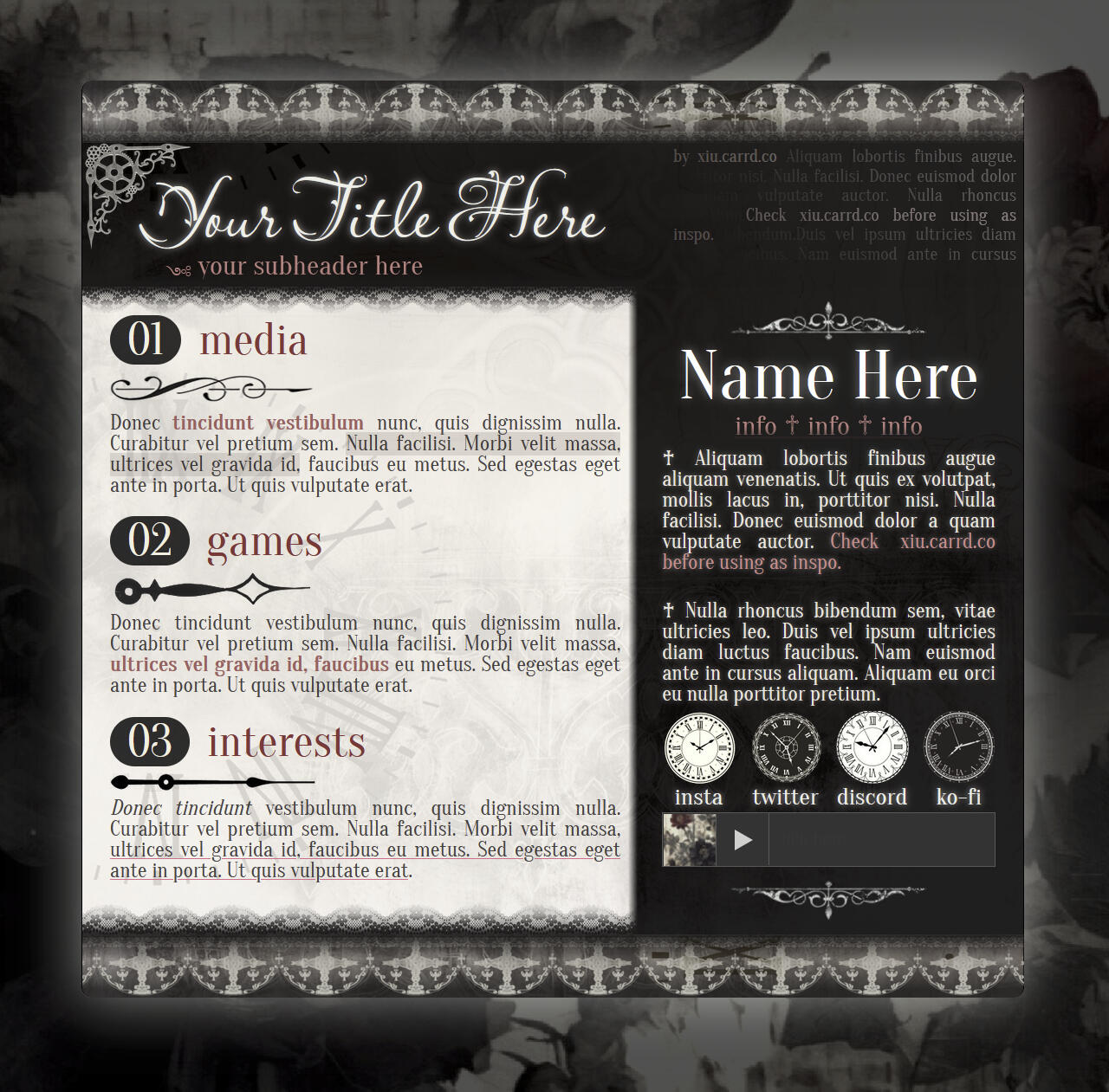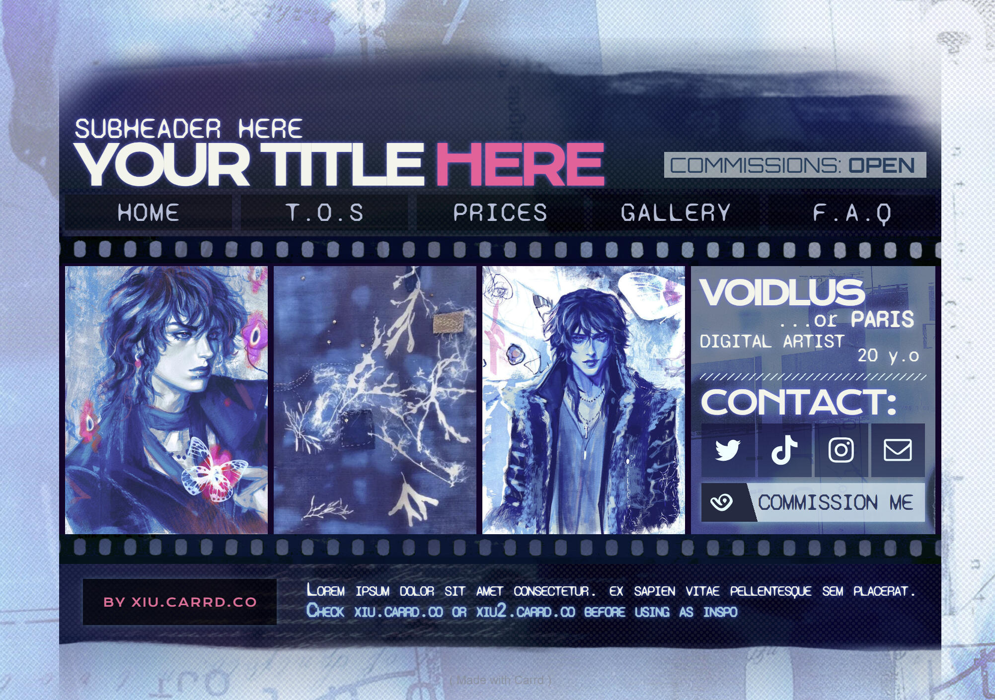 If you have an existing Carrd/Strawpage/Rentry/Google Doc/etc, I can insert the text from those platforms into your Carrd. You can also send the text to me over DMs! This is not mandatory, and I will default to using Lorem Ipsum if you don't have text available for me to use.