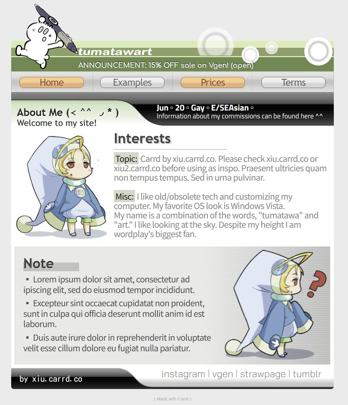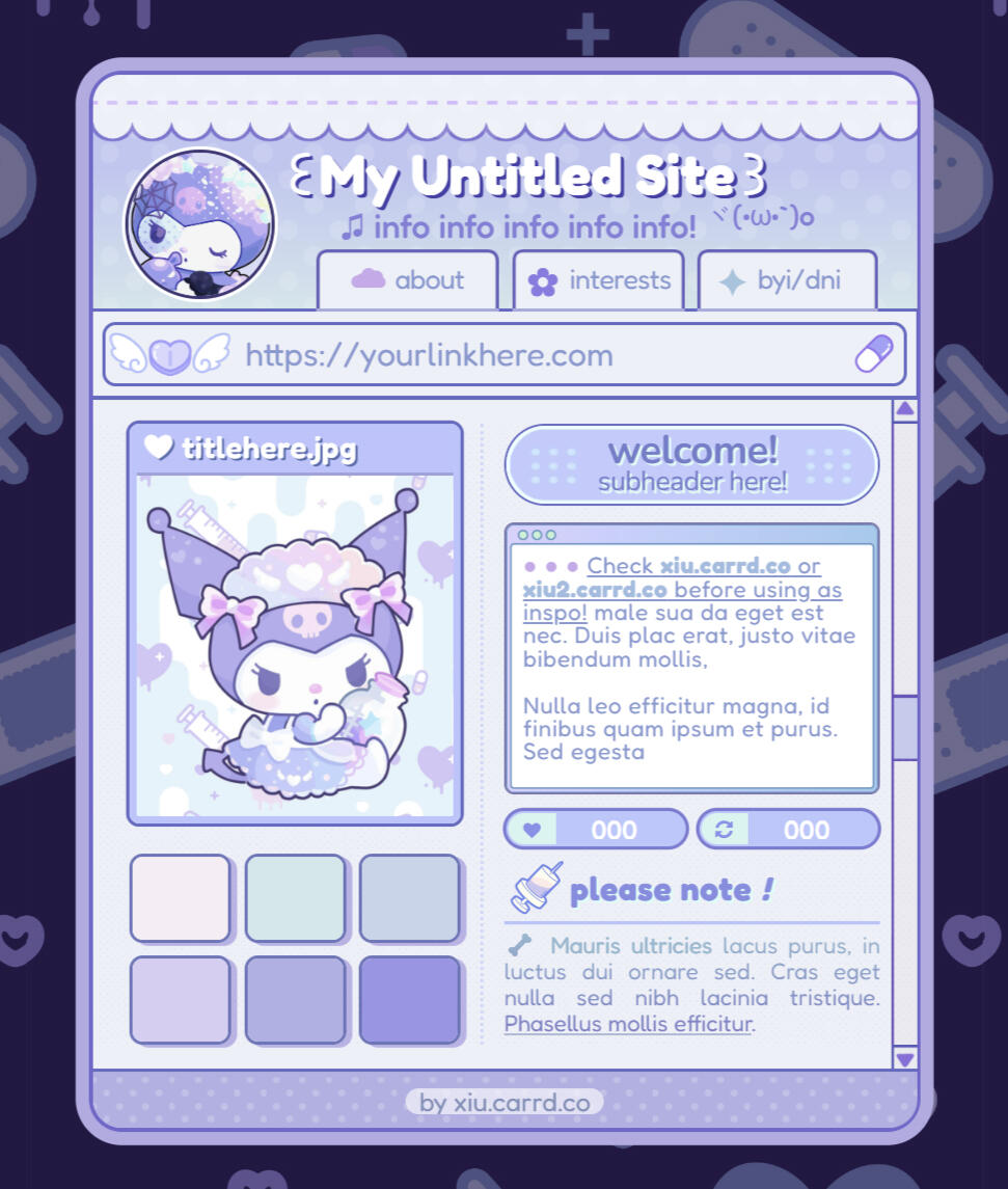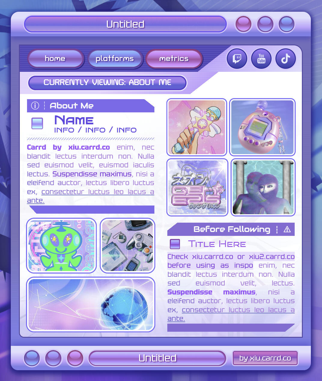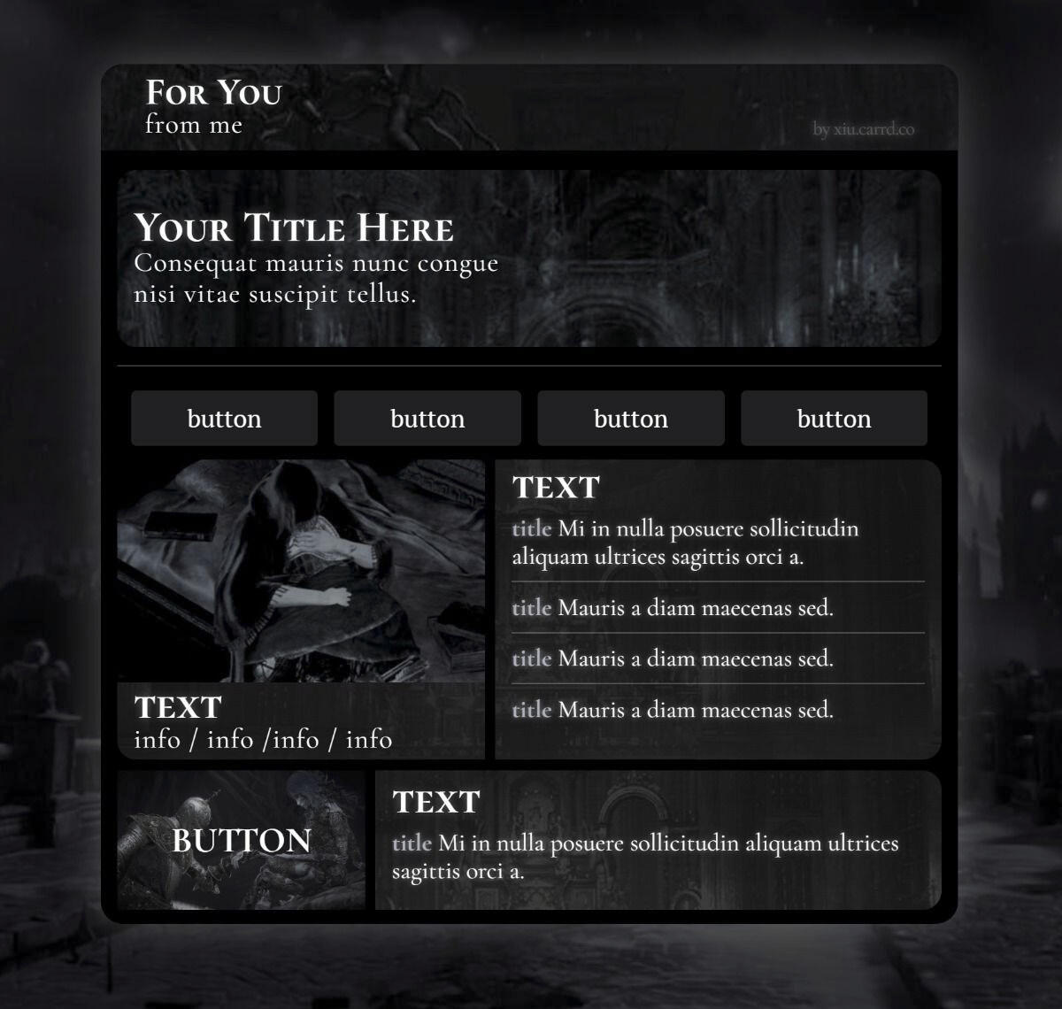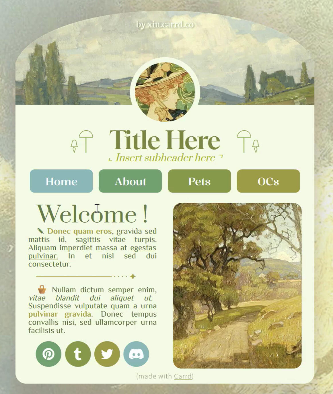 If you have an existing Carrd/Strawpage/Rentry/Google Doc/etc, I can insert the text from those platforms into your Carrd. You can also send the text to me over DMs! This is not mandatory, and I will default to using Lorem Ipsum if you don't have text available for me to use.