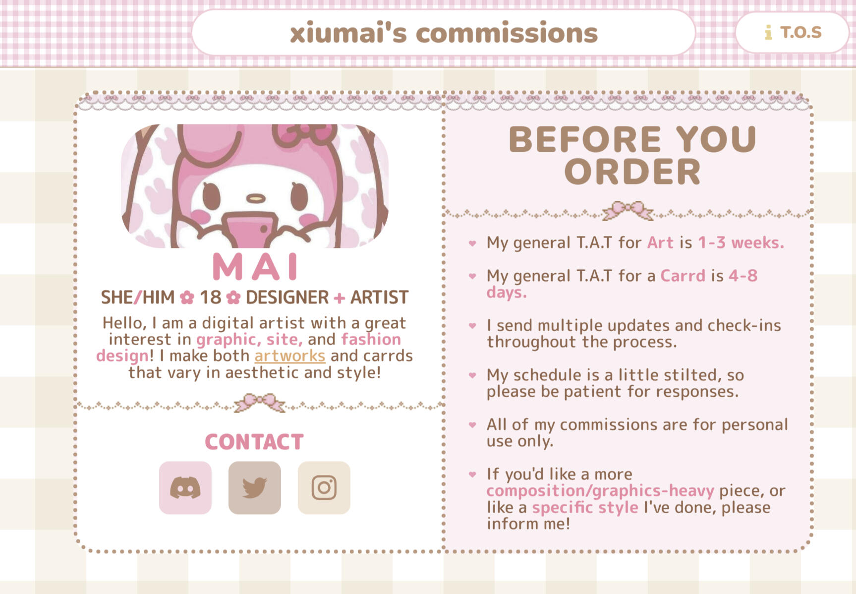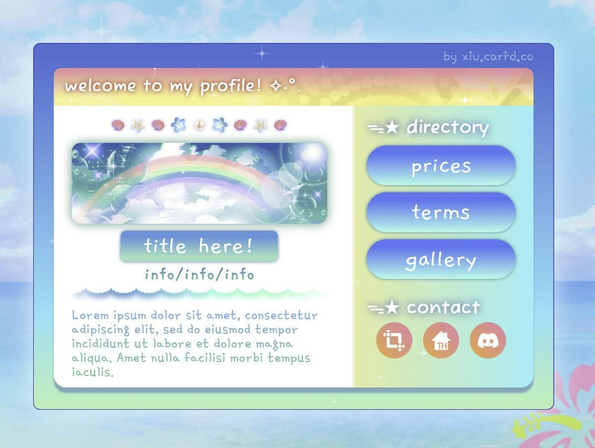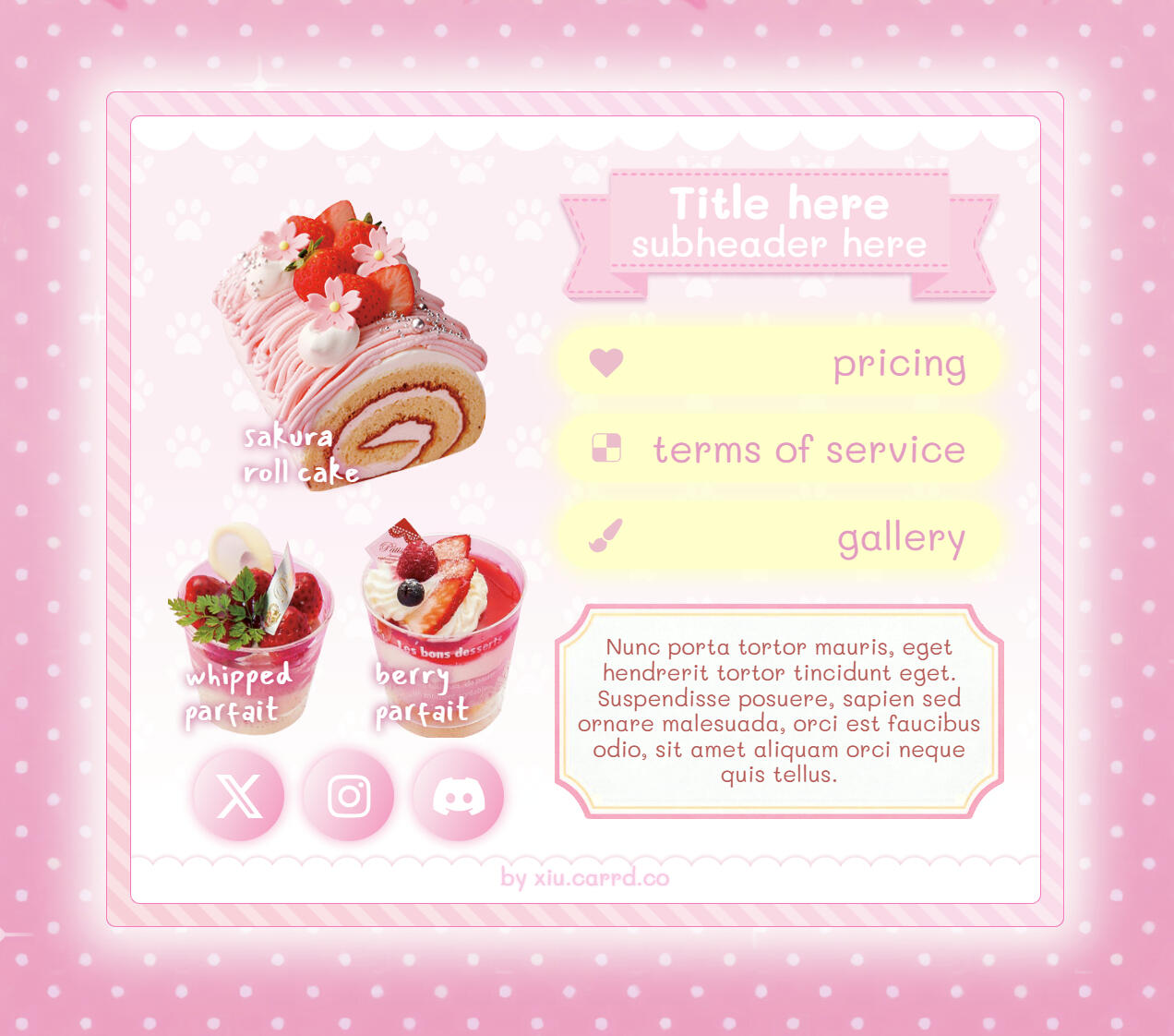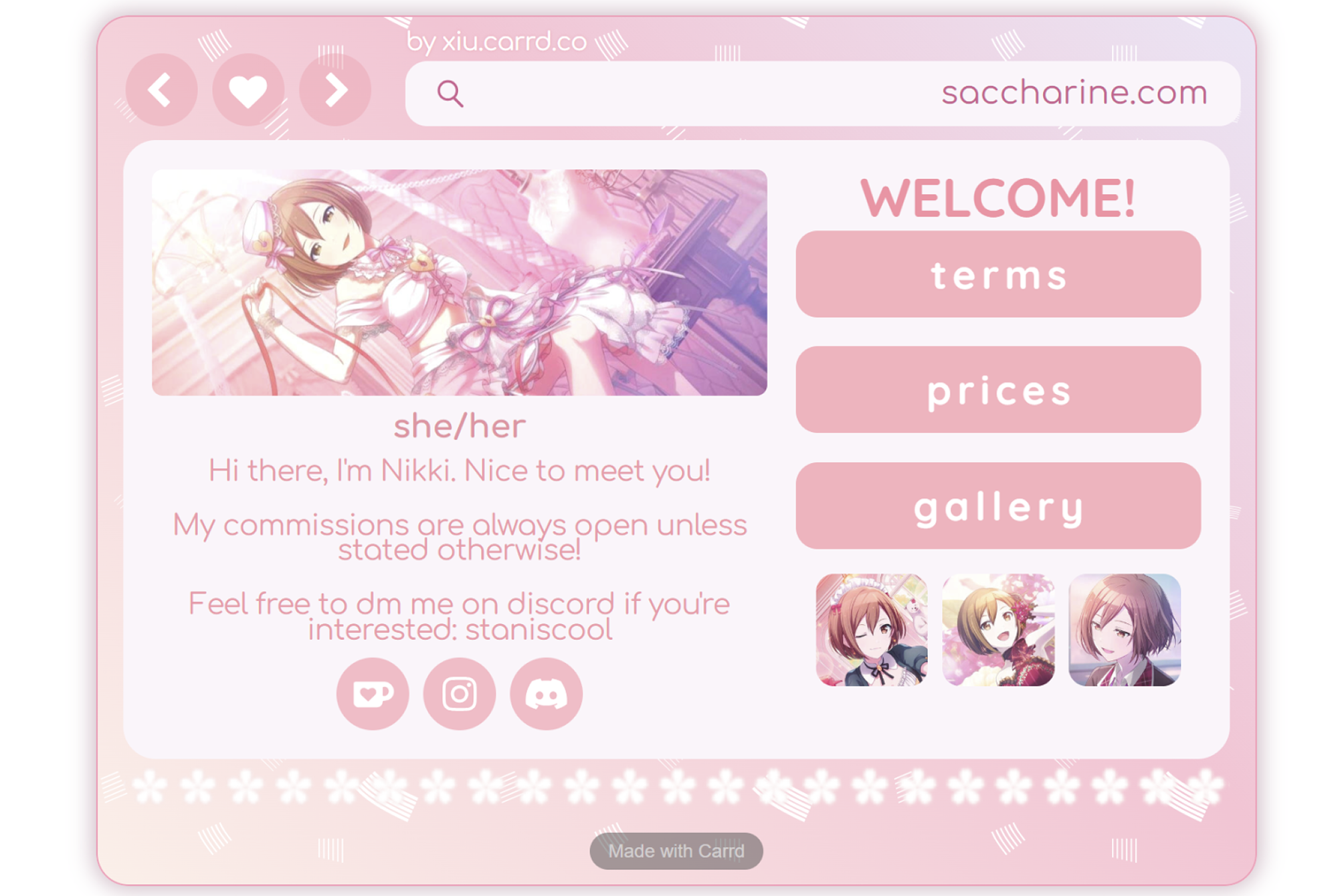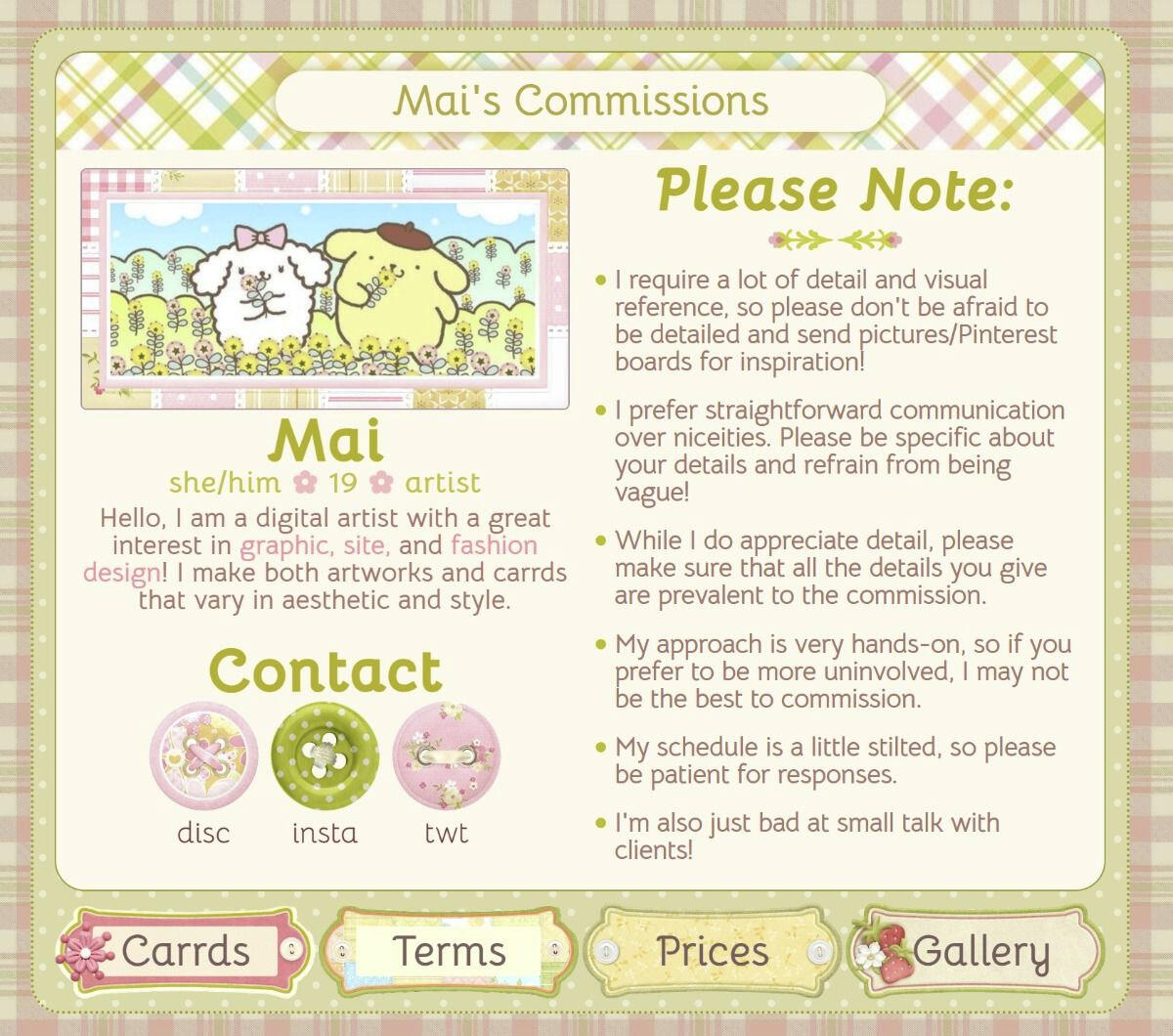 For example, a client may want a Carrd that's mainly pink, white, and blue with a simple soft feel, themed after Sakura blossoms and the sea, with some additional flower/pastry motifs. That's describing the aesthetic!