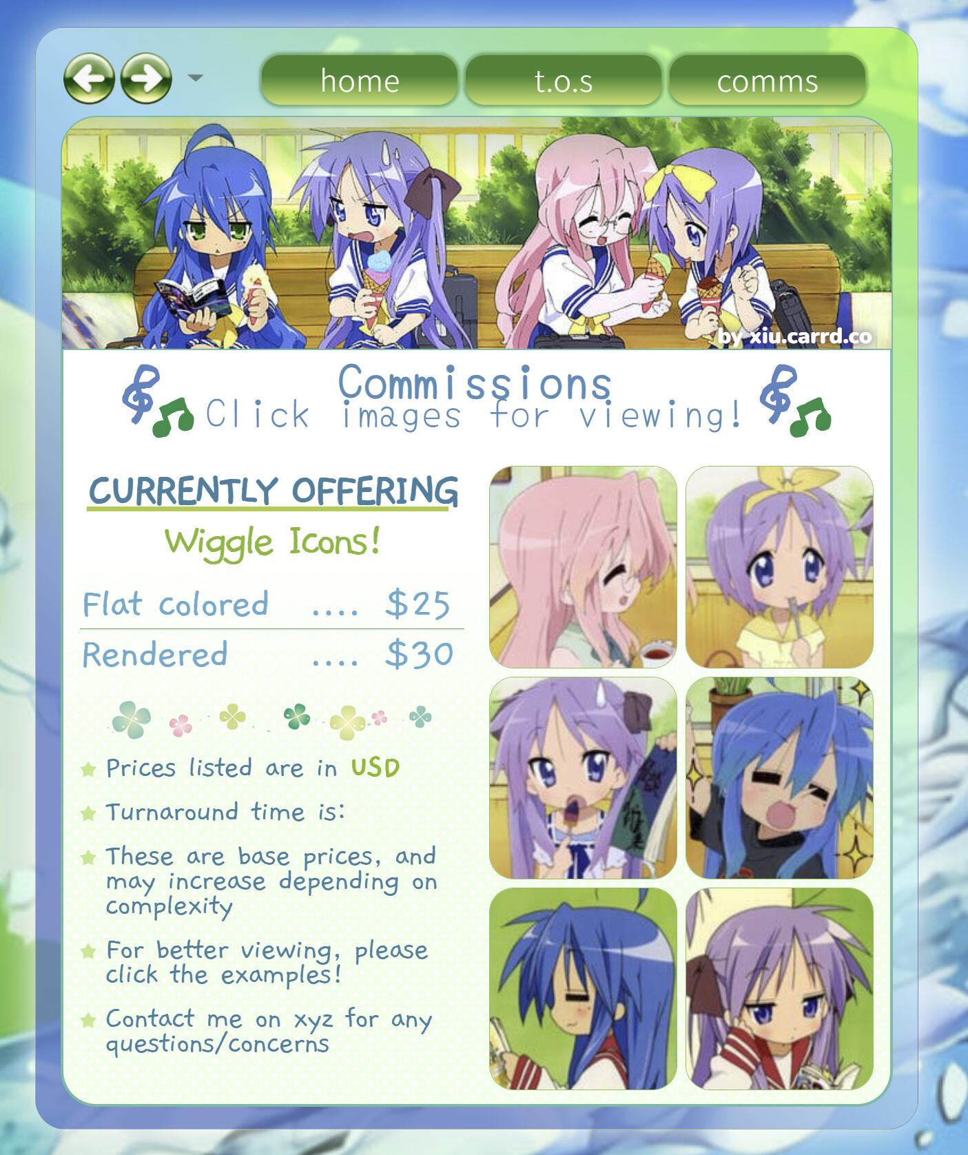 Refrain from using vague language or relying too much on terminology! My interpretation of what's gothic/whimsical/cute/etc. may be different from yours, and I may not know certain aesthetic styles. Please send image references and explain thoroughly!