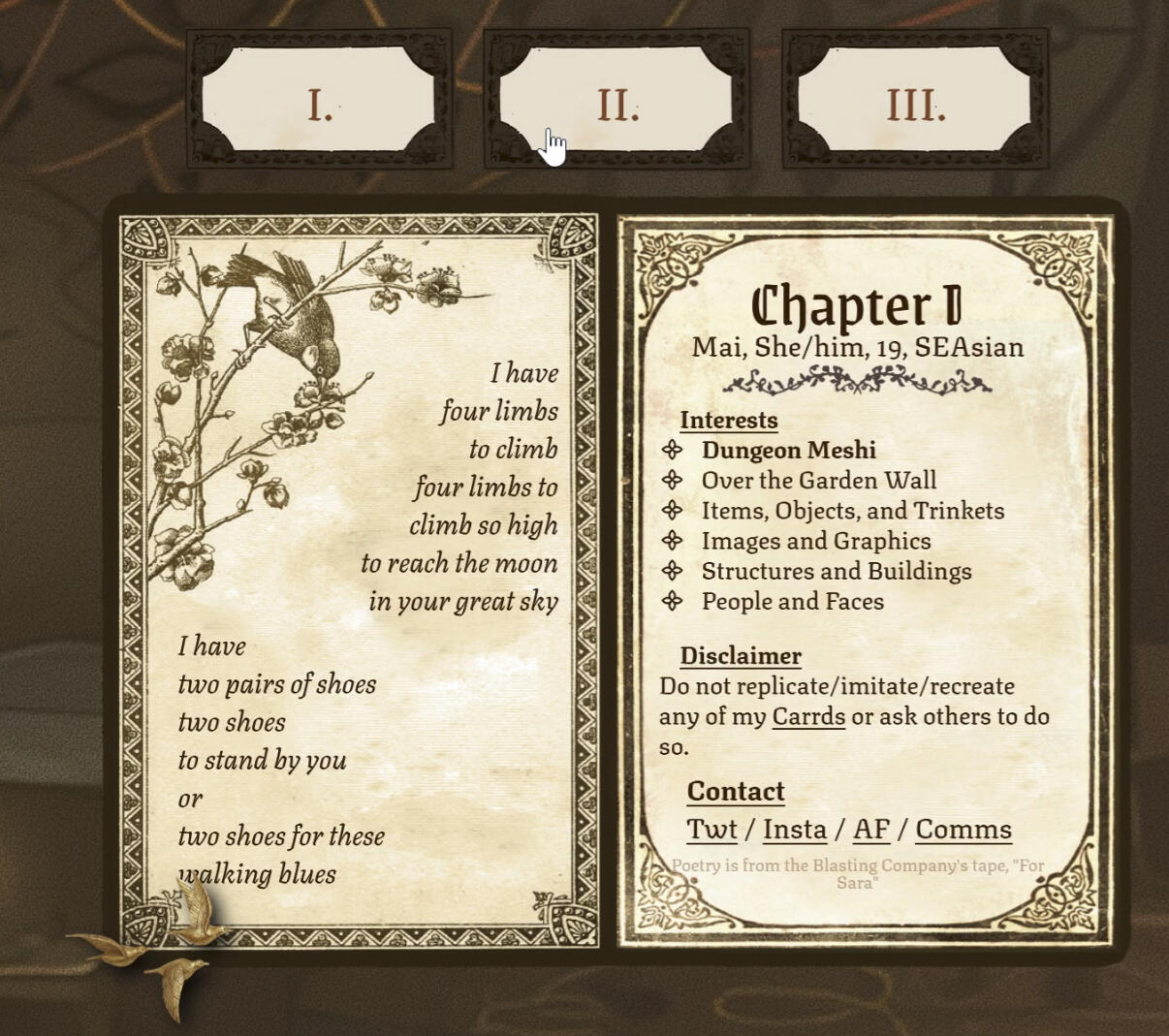 If you have the Free Carrd plan, there is a 50 element limit. Because of this, most Carrds cap at 3-4 pages. If you have the Free Carrd plan, please be comfortable with compromising some ideas!