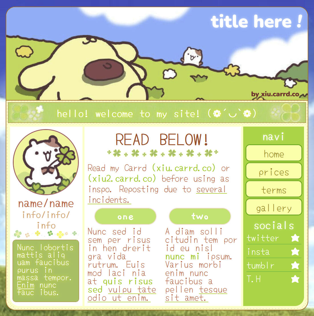 Clients may not remove any watermarks I place on their site (by.xiu.carrd.co), claim it as their own work, or resell/transfer sites I've made to others.